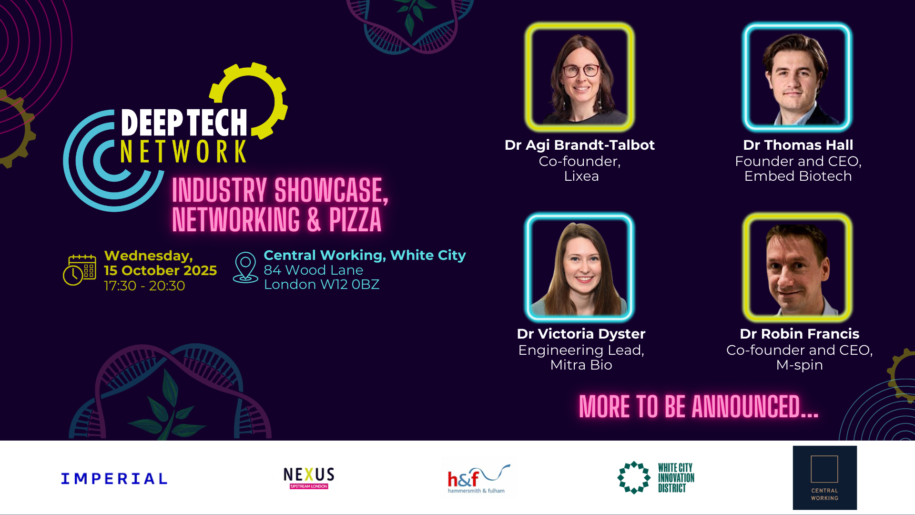 If you’re a science, tech or engineering business, academic or startup using deep tech to improve our world, and are based around White City’s Innovation District, this event is for you. Free drinks and pizza!